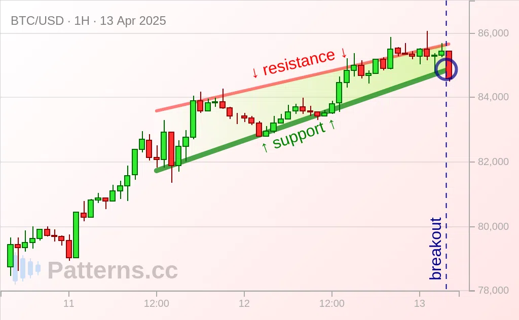 A rising wedge is almost done, the price is ready to break out. A rising wedge typically spots a bearish move if price breaks out to the the downside. It is possible that a rangebound towards the 84000 zone will happen on a breakout of the rising wedge as sell-off may continue.