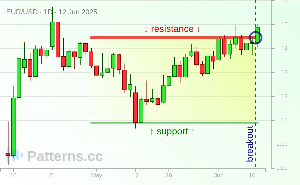 There is a rectangle detected, the price is about to break out. A rectangle describes a compelling chart indicator that is used to predict extending an uptrend when price breaks out to the the upside. It is likely that a bullish move to 1.15 will be made on a breach of 1.146 amid rising bets for the move.