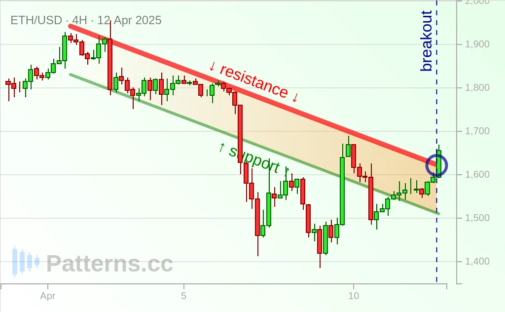 The price builds a descending channel, the price asks for an active bullish action as a clue of a breakout. A descending channel denotes a price formation that has a downward slope that can be used to spot that prices are likely to keep rallying upward in case if price breaks through the resistance. ETH/USD to continue higher to the 1700 level.