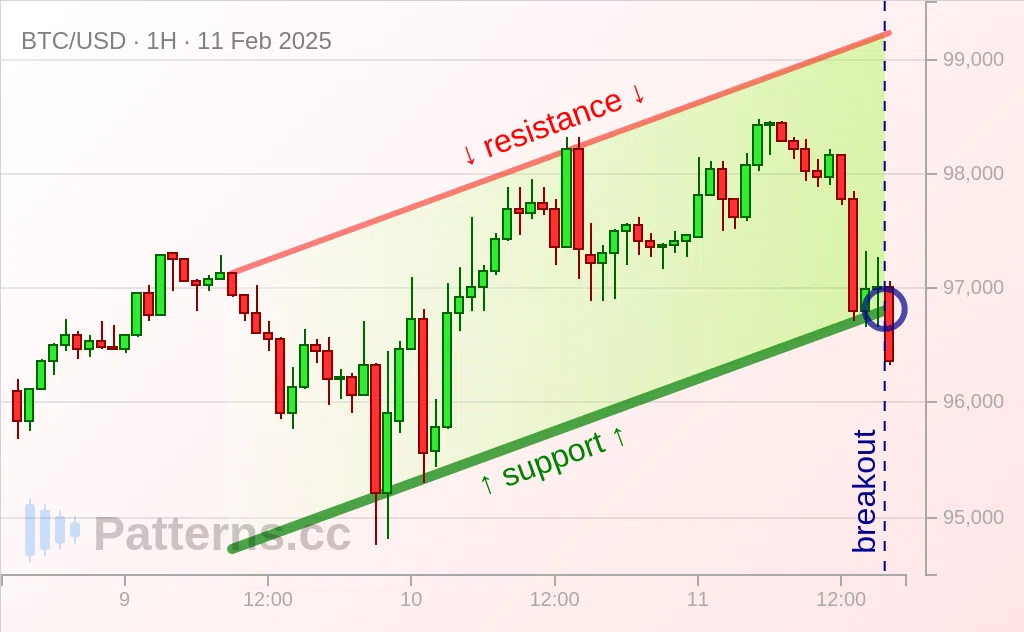 There is an ascending channel materializing and the price is going to break out. If price breaks down, the resulting move could indicate that the price to go short. A move to 96000 is probable on a breach of 96600.