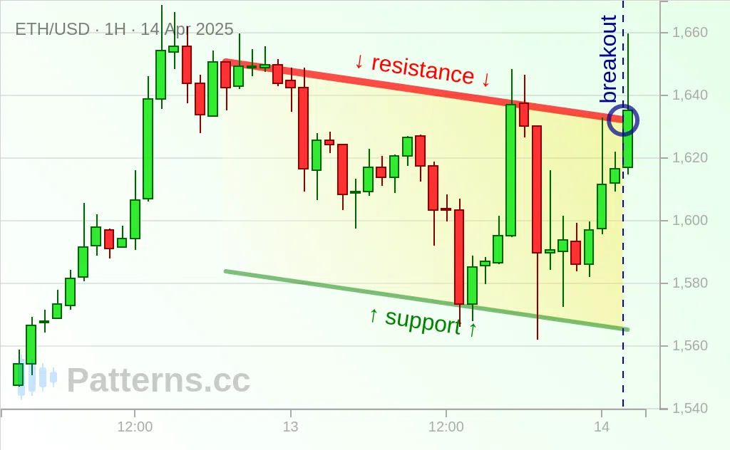 The price creates a descending channel, the price is about to break out now. In case if price breaks out to the the upside, the resulting move could predict a downward trend is nearing its end. ETH/USD could attempt a move towards 1660.