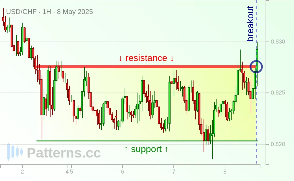There is a rectangle distinguished, the price demands a further steady bullish action as an indication of a breakout. A rectangle depicts a technical price signal that is used to identify that the price will rally further in case if price breaks out to the the upside. USD/CHF pushes higher towards the 0.83 level while above 0.828.