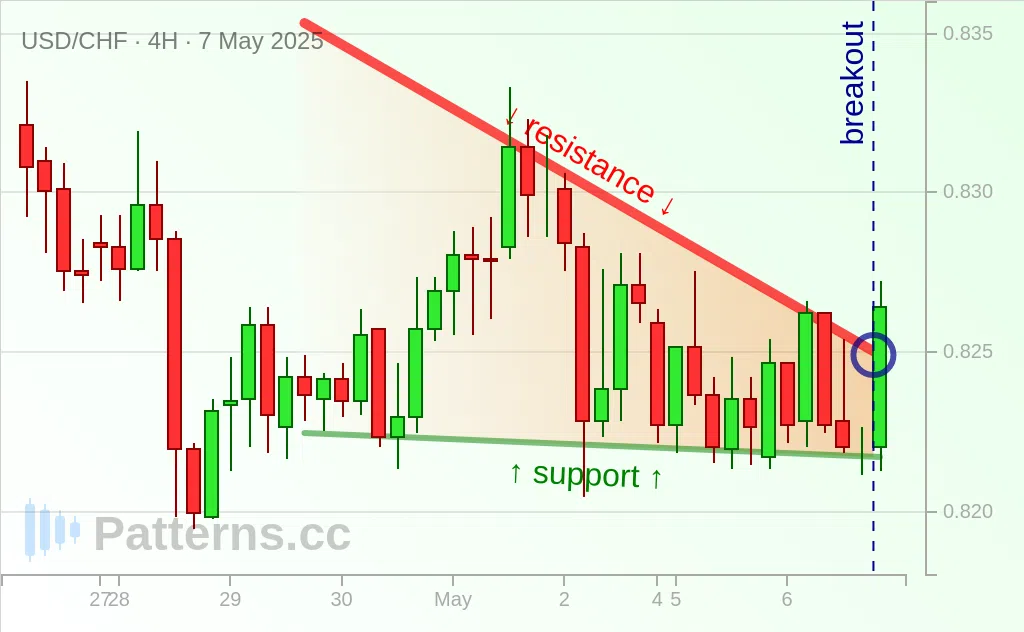We can see that the price gives a descending triangle, USD/CHF lacks a further bigger bullish continuation to confirm descending triangle breakout. Once price breaks out to the the upside, the move could predict a bullish price move. USD/CHF to increase bullish potential to the 0.828 zone as uptrend may continue.