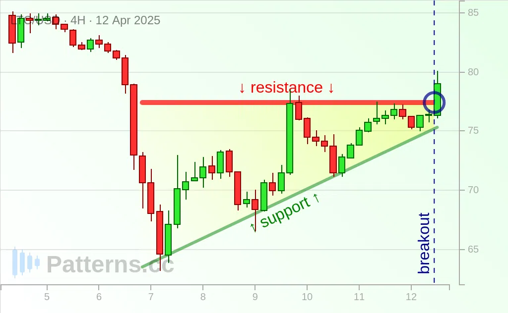 There is an ascending triangle occuring. An ascending triangle tends to be a compelling indicator that can be used to predict a bullish price action once price breaks through the resistance. LTC/USD turns bullish towards 80 on a upside break.