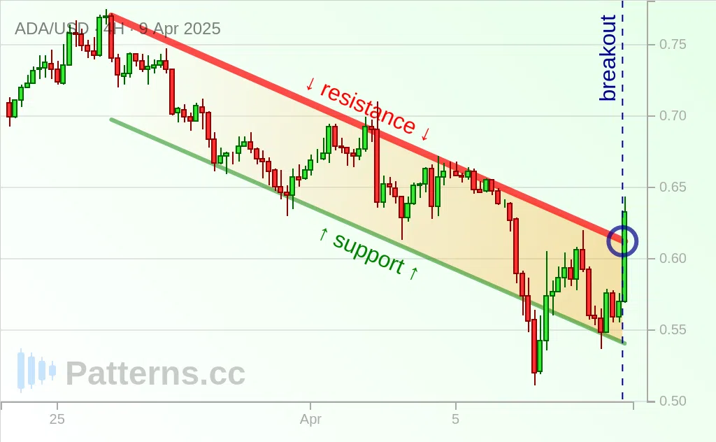 There is a descending channel taking place and the price requests a more strong move as a verification of a breakout. If price breaks out to the the upside, the move could predict a potential reversal in price action. ADA/USD to jump to 0.65 on a breach of 0.62.
